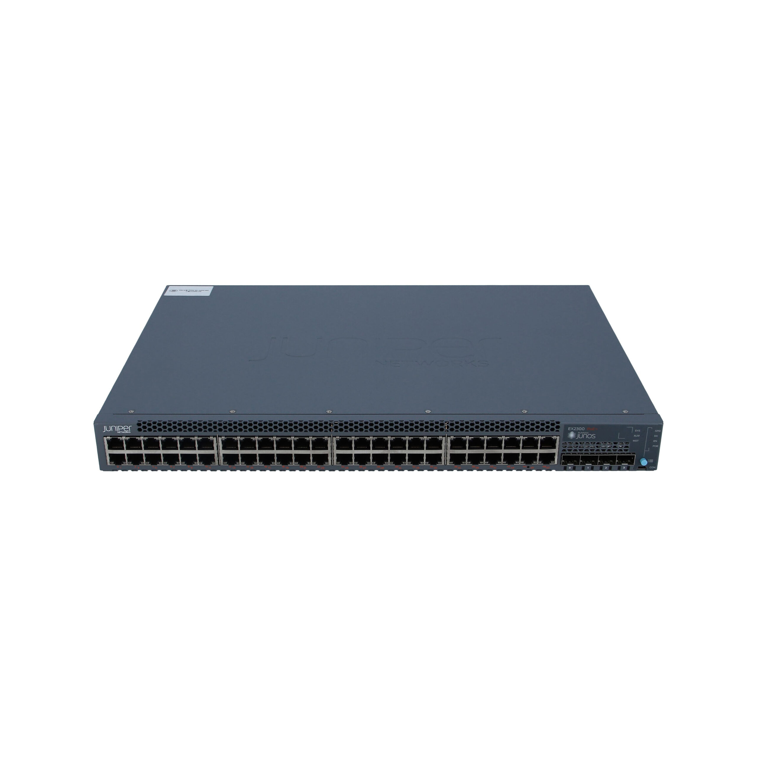 The EX2300-48P Layer 3 Switch by Juniper Networks, Inc (EX2300-48P) is a high-performance Layer 3 Switch. It features a total of 48 network ports, including 4 x 10 Gigabit Ethernet Expansion Slot. The device supports Optical Fiber and 10 Gigabit Ethernet technology (10GBase-X). It is Yes and comes with Yes management options. Additionally, it includes 4 SFP+ slots for further network flexibility. This product operates with Power Supply and has a Lifetime.The device has a compact 1U rack mountable form factor and is also Rack-mountable. The product’s dimensions are 1.8″ height, 17.5″ width, and 12.2″ depth, with an approximate weight of 11.07 lb. Certified as GS, this product is also environmentally friendly.
